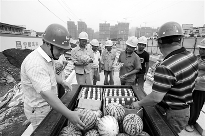 “各位工友快来,项目上给我们发西瓜和矿泉水了……”7月16日,南京市栖霞区丁家庄保障房工地,中铁上海工程局市政公司南京丁家庄保障房项目现场,几十名挥汗作业的施工人员领取了项目部为他们准备的降温食品。