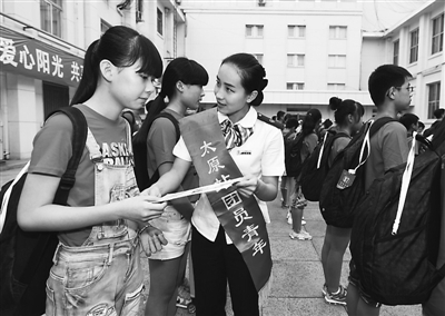 7月18日,在太原火车站广场,太原火车站的客运员任玮给孩子讲解安全出行常识。