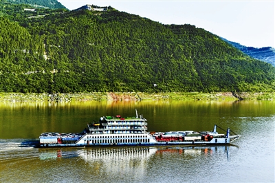 7月18日,重庆,一艘满载集装箱的大型滚装船(上行船舶)行进在三峡云阳水域。