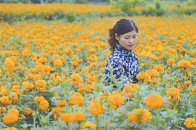 近年来,当地通过“公司+基地+农户”的订单管理模式,助推当地花卉特色农业发展,万寿菊种植亩产达6000多斤,农民收益可达3000多元,已成为当地脱贫的“致富花”。万寿菊的花朵是天然叶黄素的主要原料,素有“软黄金”之称。春雨 摄/视觉中国