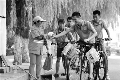 7月17日,郑州天气闷热,华北水利水电大学15名大学组成的“小水滴”团队,用暑假勤工俭学的收入购买了30件饮用水,送给在一线工作的环卫工。