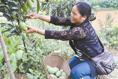 云南红河哈尼族彝族自治州弥勒市江边乡有贫困人口2926人,贫困发生率高于周边地区。2015年以来,当地扎实推进精准扶贫,成立了7个扶贫工作组和10多支驻村扶贫工作队,推进基础设施建设、易地搬迁及产业发展等工作,取得一定成效。图中的壮族农妇张玉英,就是在当地政府的引导和帮助下种植芒果实现了脱贫。新华社记者 蔺以光 摄