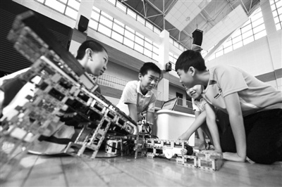 7月19日,2016世界青少年机器人奥林匹克竞赛(中国西北区)选拔赛在甘肃省兰州一中开赛,共有来自西北地区的57支中小学代表队近200名选手参加。本次比赛设常规赛、创意赛,机器人足球赛、太空挑战赛等项目,获胜者将代表中国参加今年11月在印度新德里举办的2016世界青少年机器人奥林匹克竞赛总决赛。图为几名小选手正在进行赛前准备。