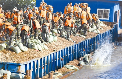 7月22日6时,长江干线湖北浠水段发生崩岸险情,直接威胁长江干堤安全。截至当日19时,事故险情得到初步控制。图为抗洪官兵在现场紧张抢险。