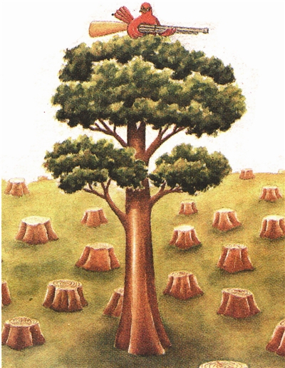 小鸟站在树上持枪凝视远方,它回忆着当年蓝天碧水和森林中宁静的环境……俱往矣,唯有守护好仅有的棲息地!