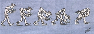 记得教科书上有幅《进化图》,表现从猿到人演变过程。这幅漫画的作者反其道而行之,揭示“退化的低头族”的不幸。