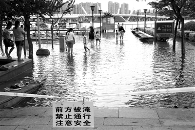 7月5日,江苏省无锡市,在蠡园公园和蠡湖大桥公园内,由于水位上涨,部分场地不适应游客游玩,公园拉起了警戒线。但是,一些游客依然不顾警戒线,进入被淹区域游玩。