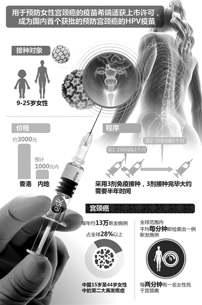 根据葛兰素史克公司公布的信息,此次获批的HPV疫苗在中国内地注册用于9到25岁女性接种。