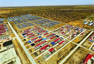 为了不让贫困的“基因”代代相传,古浪县4万山区居民“逃离”了祖辈居住的甘肃祁连山区,从海拔2500米以上的深山到毗邻腾格里沙漠的地区,不仅改变了“故土难离”的传统观念,也逐渐适应了从旱作农业到灌溉农业及设施养殖的新生活。图为7月22日航拍的移民区。
