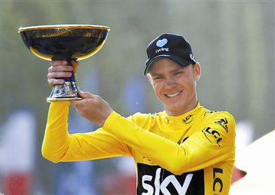 7月24日,天空车队英国车手克里斯托弗·弗鲁姆在颁奖仪式上手举冠军奖杯庆祝。
