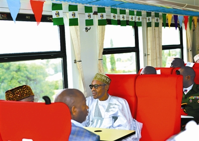 7月26日,在尼日利亚首都阿布贾西郊伊都火车站,尼日利亚总统布哈里(中)试乘客车。当天,伊都火车站充满节日喜庆气氛,一列载有300多名乘客的列车从这里徐徐出发,驶向尼日利亚中部城市卡杜纳。这标志着尼日利亚第一条现代化铁路正式运营通车。阿布贾到卡杜纳铁路(阿卡铁路)全长186.5公里,由中国土木工程集团(中土集团)负责设计和施工。