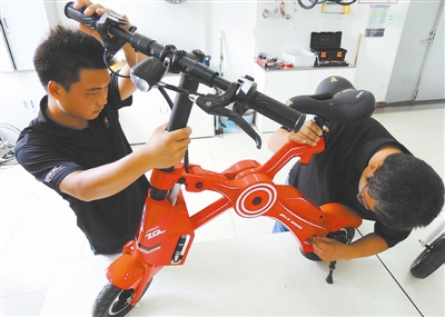 7月25日,全球首款碳纤维智能机器人电动车在江苏连云港亮相。这款碳纤维智能机器人电动车设计全面配合国家提倡的“绿色出行”理念,车架采用全碳纤维材料和先进的成型工艺,可以自由收缩和伸展,全车含电池仅重15公斤,时速可达20公里/小时,最大载重150公斤,充电4小时可以续航30公里,加上备用电池可达60公里。图为工作人员对这款电动车进行质检。