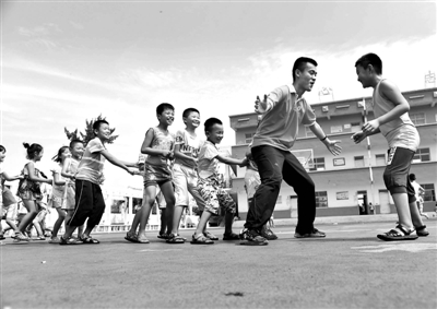 7月26日,在山东枣庄市山亭区水泉镇兴国希望小学,大学生刘秋实与留守儿童一起游戏。当日,山东科技大学(青岛校区)的14名大学生志愿者在该校创办起“留守学堂”,为附近300多名留守儿童开展为期20天的义务支教活动,与孩子们共同度过一个充实愉快的暑期。