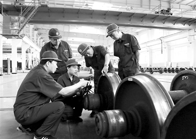 近日,沈铁吉林车辆段修制车间轮对收入班组添置了新“武器”,过去职工作业时手里拿着的本夹子变成了轻巧的手持机。只需用手持机在每条轮对的“身份证”——二维码上一扫,即可调出相关数据并录入检测信息。图为7月25日,该班组业务骨干与职工交流手持机操作要领。 孙红玉 刘浩摄