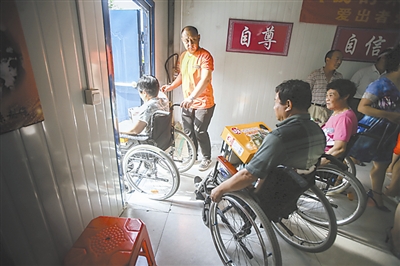 唐山康复村,村民领取一企业的慰问品。免费生活在这里的村民都是因地震致残。