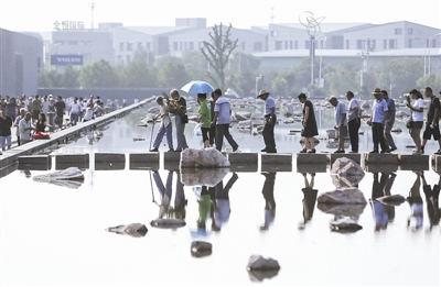 7月28日,前来祭奠的人流依次走过广场里的纪念水池。