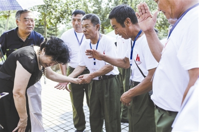 7月28日,在地震遗址公园,孙瑞兰老人向当年参与救援的解放军战士鞠躬致谢。