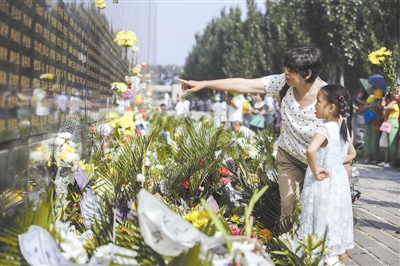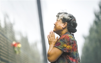 7月28日,是祭奠的正日子,艳阳当空,三伏天的闷热并没有阻止前来祭奠的人流。人们手捧鲜花,默默前行,在巨大的纪念碑前寻找亲人的名字。这座高7.28米、全长近500米的高墙上,镌刻着唐山大地震24万罹难者的名字。