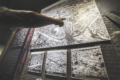 左图:唐山地震博物馆里展出的当年地震发生后不久航拍到的影像资料。