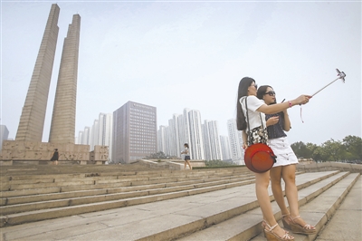 右图:在唐山市中心的抗震纪念碑前,两位女孩自拍留影,远处是拔地而起的座座高楼。