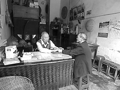 哐当一声,卷帘门打开。一个老者露出头来,笑着和大家打了个招呼,只见第一个人就坐在了柜台前的凳子上。
