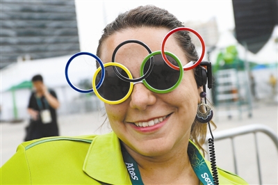 7月29日,在巴西里约巴哈区奥运会主新闻中心外,一名工作人员展示奥运五环墨镜。