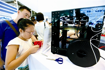 7月31日,山东省青岛市,一名小朋友在展会上进行3D打印体验。