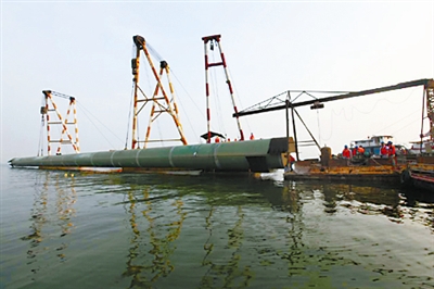 7月27日,徐州骆马湖水源地第三标段施工现场,中铁上海局市政公司员工冒着酷暑在湖中心吊装最后一节内径2.6米、长80.4米、壁厚28毫米的原水取水管道。大口径长距离钢管引水管线最后一节的就位,标志着徐州骆马湖水源地原水管全线贯通。