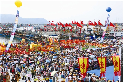 图为当地政府和近万民众在码头举行隆重仪式庆祝新港开港,以及一年一度的南海伏季休渔结束后正式开渔。