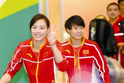 8月1日晨,中国跳水队运动员吴敏霞(左一)和队友抵达巴西里约国际机场。
