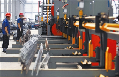 8月2日,工人在位于天津市武清区的生产预制装配构件的车间里工作。