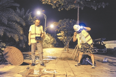7月28日,海口,夜幕下的椰城景色宜人。听漏工一行三人沿线管道巡查,一片静寂中,他们齐刷刷地把耳朵贴在听漏棒上,仔细地辨别来自地下的微弱异声,就像医生一样给病人看病,这就是他们每夜的工作。 据了解,听漏是为了找到地下水管是否渗漏,防患未然,需要在安静的深夜工作,杂音少,用水量也小,听漏效果最佳。