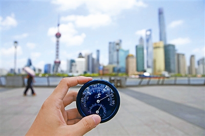 8月2日,在上海外滩观光平台,手持温度计实测温度超过38℃。 新华社记者 丁汀 摄