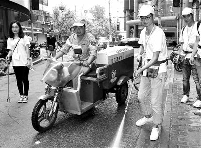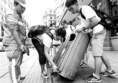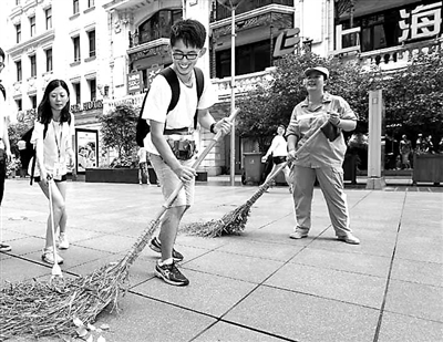 8月3日,几名大学生在上海市南京路沿线清扫街道。