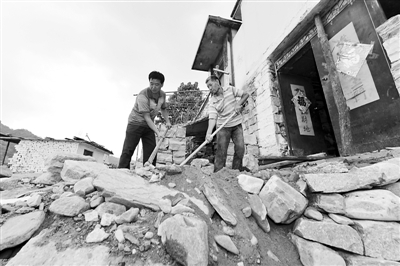 8月3日,陈怀明(左)和村民一起清除道路上堆积的石块。