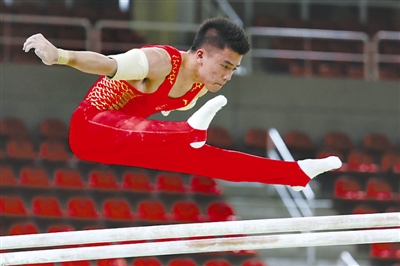 8月3日,里约奥林匹克体育馆,中国男队队员林超攀在双杠训练中。里约奥运会体操比赛将于8月6日拉开战幕。