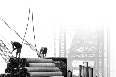 7月23日,在浙江省宁波市北仑区梅山春晓大桥的施工场地上,四川路桥集团的起重工正在紧张地吊装作业。该桥全长约1.9公里,主跨336米,主体预计今年年底完工。建成后,它将成为世界上最大跨径跨海拱桥。