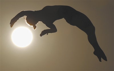 8月4日,参加里约奥运会跳水比赛的运动员在夕阳的余晖下进行训练,优美的身影定格在天地之间。