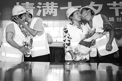 8月8日,在合肥市的一处建筑工地上,建筑工人亲吻妻子。