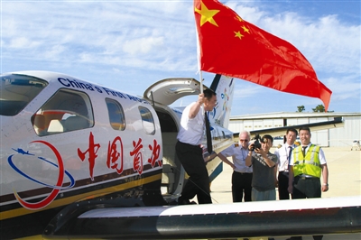 8月7日下午,沈阳通航产业基地法库财湖机场,“中国首次环球飞行”飞机在法库财湖机场降落,机长张博走出机舱。