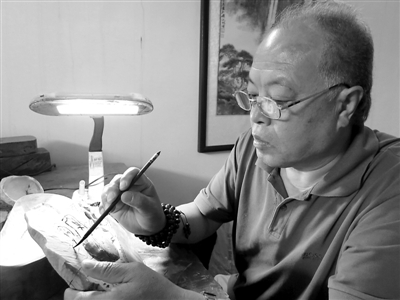 杨克全在工作室内雕刻玛瑙。 本报记者 刘旭 摄