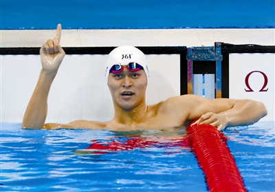 8月7日,孙杨庆祝晋级男子200米自由泳决赛。 新华社记者 王丽莉 摄