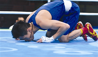 8月8日,在2016年里约奥运会拳击男子46~49公斤级预赛中,中国选手吕斌不敌肯尼亚选手蒙加伊·瓦瑞。里约奥运会拳击比赛开赛至今,中国队尚未取得一场胜利。图为吕斌在比赛失利后亲吻拳台。 新华社记者 蔺以光 摄