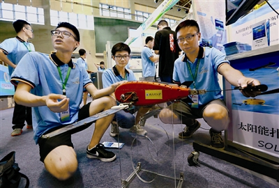8月10日,江苏镇江,西北工业大学学生在介绍他们设计的太阳能扑翼滑翔水下航行器。