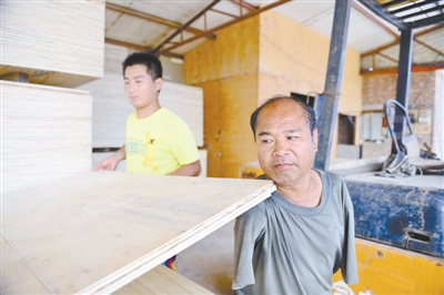 赵丙辉在自家木器加工厂搬运木板成品(8月9日摄)。