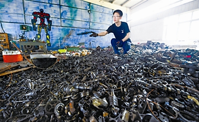8月11日,工作人员从废旧零件堆里挑出所需材料。