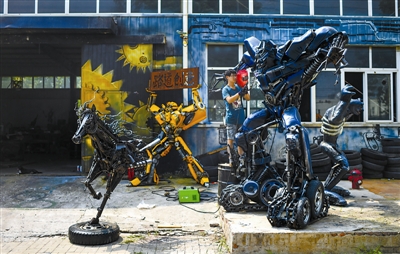 一走进天津凌奥产业园大门,就能看到门口摆放着各种各样的“变形金刚”,从8米高的擎天柱到齐膝高的机器人,全部由废旧汽车零件组成,轴承、齿轮、轮胎、轮毂、避震器、离合器应有尽有。这些作品来自一家名为路道社的初创公司,设计制作人员大多是一群刚毕业的“90后”大学生。