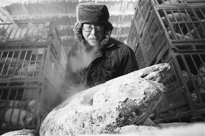 8月11日,保管员李军强在超低温冷库搬运金枪鱼。2005年2月,李军强来到山东中鲁远洋(烟台)食品有限公司,当上超低温冷库保管员。炎炎夏日,外面气温在30摄氏度以上,而冷库温度为零下60摄氏度,他每天要进出超低温冷库二三十次。 申吉忠 摄(新华社发)