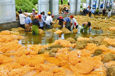 8月10日,江苏紫菜良种场员工忙着搬运刚刚采好坛紫菜苗的第一批网帘。