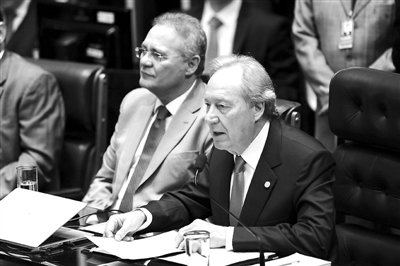 8月9日,在巴西首都巴西利亚的巴西参议院,联邦最高法院院长里卡多·莱万多夫斯基(右)主持会议。巴西参议院10日凌晨进行了针对总统罗塞夫弹劾案的第二轮投票,以多数票通过特别委员会(特委会)经修改后的弹劾报告。罗塞夫将在本月底接受参议院的最终表决。